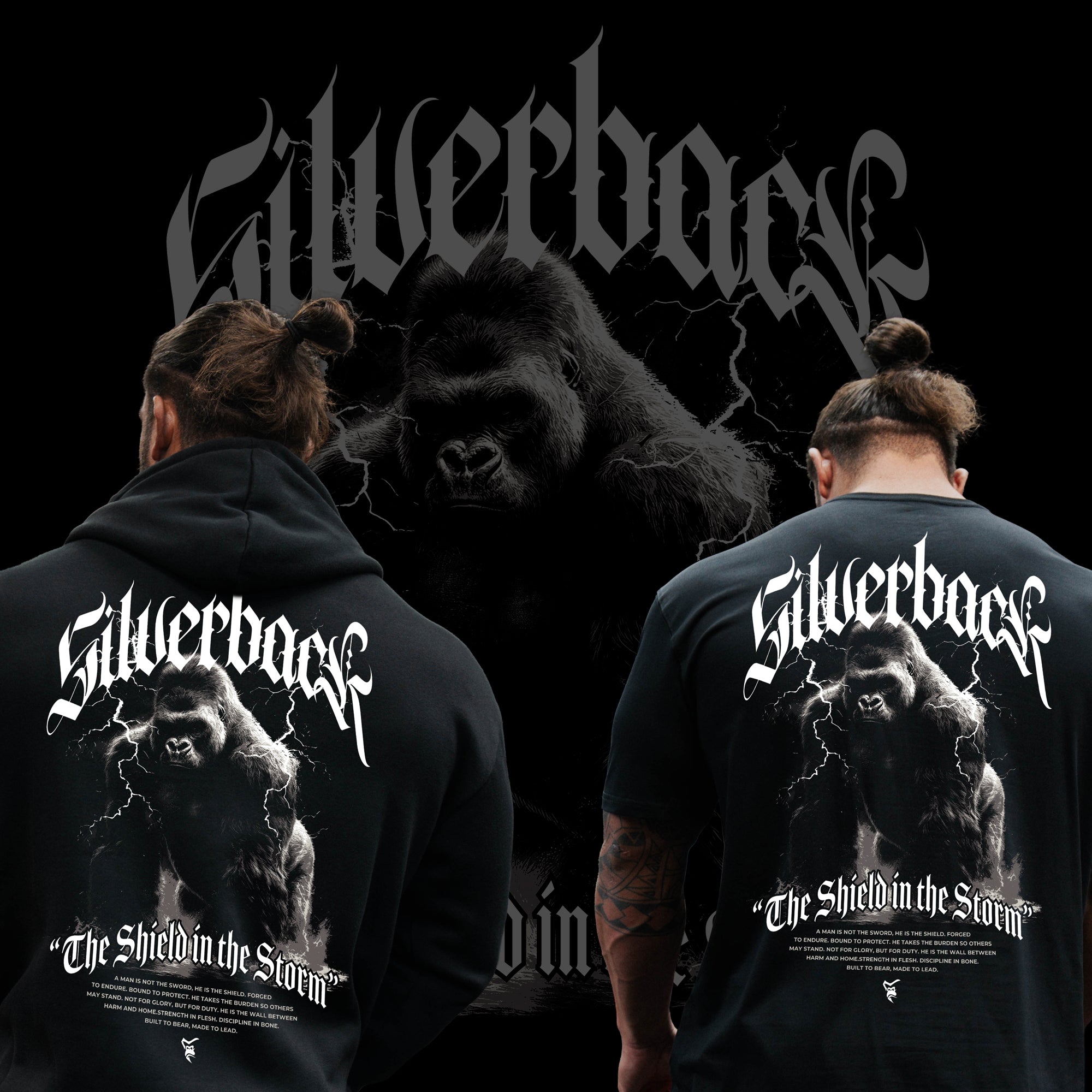 At the centre of the back design stands the silverback gorilla, emerging through cracking lightning, a symbol of strength under pressure and protection without hesitation. The gothic Silverback script crowns the design, bold and unmissable, while “The Shield in the Storm” sits beneath it as a statement of purpose. The accompanying text reinforces the role of the man as the anchor of the household, absorbing impact, standing firm, and leading with discipline rather than noise.